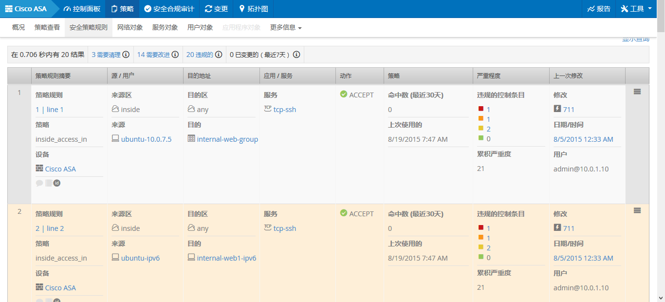 許多防火墻上均會(huì)存在一些過于“寬松”的安全策略,包括允許了過多的IP地址、允許了過多的服務(wù)端口,或者直接是’any’類型的安全策略。這不符合安全策略配置的一般性原則,需要進(jìn)行“收斂”。通過Firemon產(chǎn)品的Traffic Flow Analysis功能,管理員可查看任何一條安全策略的流量詳細(xì)信息,包括各種應(yīng)用的命中次數(shù)等。管理員可以根據(jù)該報(bào)告制定更加有針對(duì)性、更加準(zhǔn)確的安全策略,從而提升防火墻的安全性。