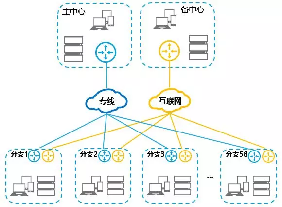某單位下轄58個分支機構(gòu),內(nèi)部業(yè)務(wù)系統(tǒng)有郵件、OA、文件服務(wù)器、AD域、內(nèi)部管理系統(tǒng)、VoIP、視頻會議、流媒體、虛擬應(yīng)用和虛擬桌面等主要跑在MPLS線路上,分支機構(gòu)也有DSL線路提供訪問互聯(lián)網(wǎng)、備份線路和提供WIFI。為了保證低延遲,高帶寬等應(yīng)用系統(tǒng)網(wǎng)絡(luò)的可用性,有時必須要擴展WAN的帶寬,直接帶來的結(jié)果是成本的明顯提升。