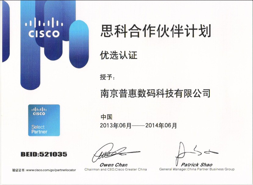 南京普惠數(shù)碼科技有限公司長(zhǎng)期以來(lái)一直與全球領(lǐng)先的互聯(lián)網(wǎng)設(shè)備供應(yīng)商思科以優(yōu)選認(rèn)證合作伙伴的資質(zhì)長(zhǎng)期合作,公司擁有多名資深、經(jīng)驗(yàn)豐富的技術(shù)人員,為客戶量身訂制端到端的網(wǎng)絡(luò)方案以及提供網(wǎng)絡(luò)維護(hù)、優(yōu)化等方面的技術(shù)支持和專業(yè)化培訓(xùn)服務(wù)。