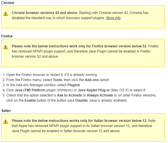然后在網(wǎng)上搜索“Please install Java on this browser to view AVRPortal” 在Java官網(wǎng)找到一篇文章(https://java.com/en/download/help/enable_browser.xml),文章大概內(nèi)容是講安裝Java后Applet無法運行是因為Web瀏覽器中未啟用Java。文章中更是提到了現(xiàn)在很多新版瀏覽器不再支持Java插件,而且 Chrome從42版本開始便停用瀏覽器支持插件的標(biāo)準方式,同時新版Firefox刪除了NPAPI插件支持,因此使用Firefox瀏覽器52版本及更高版本的用戶更是無法啟用Java。